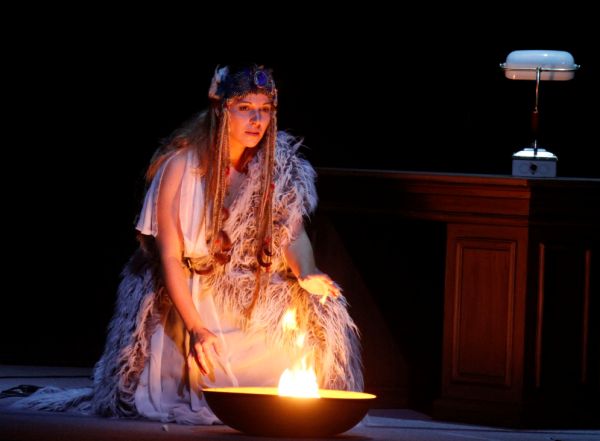 Das Libretto vermittelt etwas Anderes, was auch Fragen an die Ausstatterinnen (Monika Biegler, Kathrin Hegedüsch) notwendig macht, ob vier nüchterne Büroräume auf Drehbühne und moderne Kostüme dem Hagener Konzept wirklich aufhelfen. Vor allem verliert sich Frau Fuchsberger in abstruser Personenführung. Die Sänger müssen beispielsweise ständig auf Sessel, Schreibtische und anderes Mobiliar klettern. Amelia ist mal lebendig, mal zusammengebrochen, mal (offenbar) tot auf der Bühne präsent. Ihre große Arie gleicht einer dämonischen Ulrica-Beschwörung. In Folge ist die Sängerin ausgiebig damit beschäftigt, schweres Mobiliar hin und her zu wuchten. Der Symbolwert ist vermutlich noch schwerer.