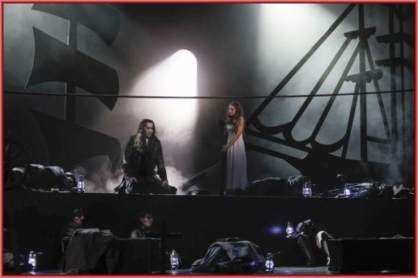 Friese erliegt auch nicht der Versuchung die dramatische Musik Wagners im ersten Akt mit angestrengter Aktion auf der Bühne zu verdoppeln, der Traum Sentas verläuft in einer ruhigen Abfolge der Ereignisse. Zusammen mit dem scherenschnittartigen Bühnenbild ergibt sich dadurch ein alptraumhaftes Tableau. Senta selbst steht als kühle Beobachterin dabei, erlebt wie ihr Vater sie für schnödes Geld verkauft, ohne Rücksicht auf ihre Bedürfnisse oder ihre Wünsche.