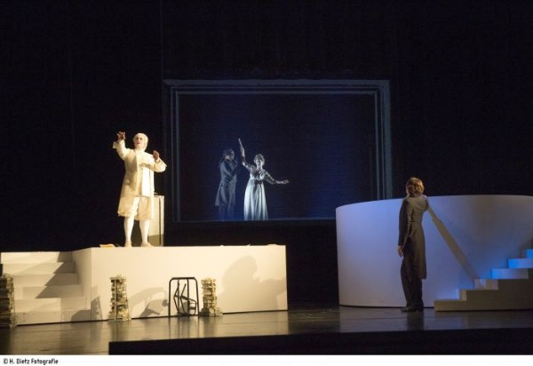 Hans Gefors schrieb seine Oper 2005 anlässlich des 200. Geburtstages von Hans Christian Andersen. Dessen Märchen „Der Schatten“ trägt viele autobiografische Züge. So verweigerte ein Freund Andersens ihm das vertraute Du, auch seine lebenslange Suche nach, stets unerwiderter Liebe, schwingt in diesem Märchen mit. Hans Gefors stellt der tragischen Handlung eine leichte, fast schon frivole Musik gegenüber. Anklänge an den Impressionismus‘ Debussys und Ravels sind ebenso gegenwärtig wie spätromantische Klänge. Annette Mahlendorfs Ausstattung, zwei weiße Podeste im Vordergrund, ein weiteres schwarzes in der Tiefe der Bühne, reichen aus, um die unterschiedlichen Handlungsorte zu visualisieren.