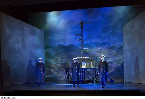 Soweit die Rahmenhandlung, der eigentliche Horror entsteht allerdings im Inneren des Leuchtturms. Hier schuf Annette Mahlendorf eine knapp fünf Quadratmeter große Plattform, der Lebensraum der drei Leuchtturmwärter. Die drei unterschiedlichen Charaktere und die klaustrophobische Enge erzeugen Spannungen untereinander. Um diesen Konflikt zu mildern, sollen Liedergesungen werden. Und damit beginnt der Schrecken Gestalt anzunehmen. Diese Lieder unterstreichen zu Beginn stets den offensichtlichen Charakter der Figur, offenbaren dann aber das wahre Wesen. Blaze, James Tolksdorf, beginnt mit einem Folksong über einem Kriminellen, Sandy, Minseok Kim, eine zarte Liebesromanze und Arthur, Rainer Mesecke, einen frommen Choral. Aber alle diese Lieder bringen die verdrängte Vergangenheit des Einzelnen an die Oberfläche. Blaze ermordete eine Frau um sie auszurauben. Diese Tat schob er seinem Vater unter, der daraufhin gehängt wurde. Sandy verging sich an einem kleinen Mädchen und brachte einen Zeugen, einen kleinen Jungen, um. Arthur offenbart seine falsche Religiosität in der er seinem Fanatismus freie Bahn lässt. Diese verborgenen Aspekte der Persönlichkeit manifestieren sich in den Bestien, die sie aus dem Meer aufsteigen sehen.