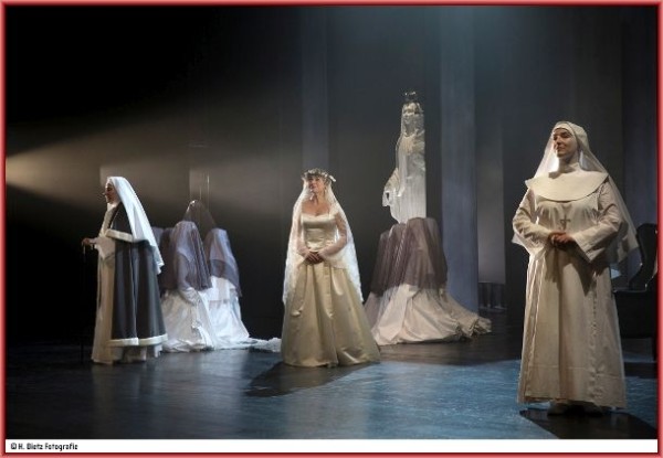 Oder anders: Der Regisseur Lothar Krause und seine Bühnen- und Kostümbildnerin Annette Mahlendorf vertrauen zunächst der historischen Schicht, um am Ende – im Sinne der literarischen Vorlage Gertrud von Le Forts – das Allgemeingültige des Stoffs eher zurückhaltend zu zeigen. Der Inszenierung ist jedoch schon von Beginn an, zumindest im Bühnenbau und dem Habit, die symbolische Abstraktion eingeschrieben: denn die Bühne imitiert kein Kloster des 18. Jahrhunderts. Eine (im übrigen herrlich illuminierte) Marienstatue muss reichen, um das sakrale Milieu anzudeuten. Wichtiger sind die massiven Säulen, die aus den geschlossenen Räumen, in denen sich wahre Seelendramen abspielen, strenge Hallen machen, in die die Männer der Revolution geschichtlich „richtig“ gekleidet einbrechen – und die Nonnen treten, historisch gleichsam „falsch“, im weißen Schleier auf. Nicht allein die freilich grau akzentuierte Blanche ist eine „Weiße“.