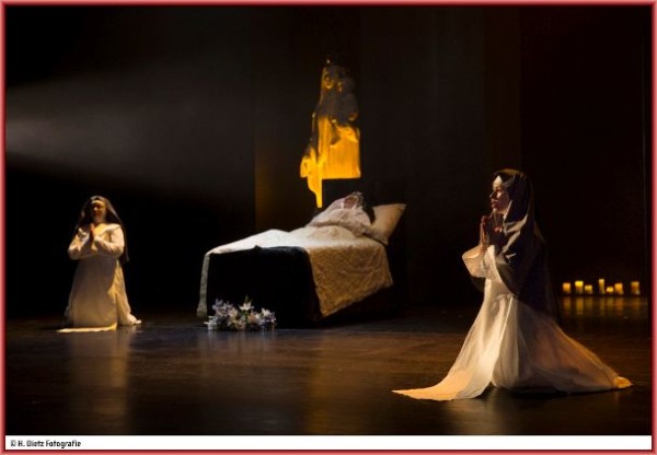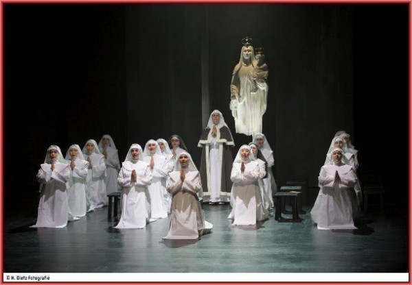Das Orchester trägt Wesentliches dazu bei; unter Arn Goerke spielen die Hofer Symphoniker meist diskret, Poulencs Subtilitäten genau ausleuchtend. Dass man sich an den „Boris Godunow“ erinnert, der hier vor nicht allzu langer Zeit von Goerke dirigiert wurde, ist kein Zufall: der Komponist hat sich bewusst auf die musikdramatischen Mittel und Motive des genialen Russen bezogen, ja sie zitiert. Auch die „Karmeliterinnen“ sind eine Choroper, doch anders als beim „Boris“ kann, ja muss man jede einzelne Sängerin nennen: Neben der Mutter Johanna der Katrin Valk und der Schwester Mathilde der Josephine Queck stehen und fallen am Ende Andrea Herold, Masako Iwamoto-Ruiter, Dong-Joo Kim, Zene Kruzikaite, Bärbel Kubicek, Malgorzata Kusmierz, Iwona Lukaszynska, Ulrike Rieß, Olga Skhodnova, Annett Tsoungoui und Aki Yamamura auf der Bühne. Die Männer aber sind, bis auf den Beichtvater (ein Glaubender, kein Fanatiker) des Karsten Jesgarz, brutal wie der Vater, der sinnigerweise zugleich den Kerkermeister spielt (James Tolksdorf) oder schwach wie der Bruder, der bei Benjamin Popson immerhin sehr schön zeigen darf, wie eine von Poulenc komponierte Puccini-Kantilene zu klingen hat.