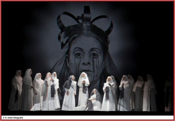 Apropos „Liebe“: Beschreiben kann man diesen Abend nicht. Der Rezensent kann nur festhalten, dass hier mit szenischen Bewegungen, die gelegentlich zum Statischen tendieren – was dieser Interpretation absolut nicht zum Nachteil gereicht – ein Höchstmaß an psychischer Spannung erzeugt wird. Festzuhalten bleiben einzelne Tableaus: der letzte Gottesdienst mit dem Beichtvater, dem Poulenc eine überirdisch schöne Musik geschenkt hat, die zu Tode betrübte Blanche, mit dem Fragment des „kleinen Königs“, den sie gerade zertrümmert hat, im Schoß: eine bewegende Pietà, die schwarzweißen Film-Einblendungen mit der Erscheinung der Muttergottes, die plötzlich blutige Tränen weint. Wie auch nicht? Im berühmten Schlussbild geht die riesige Projektion in die Gesichter der einzelnen Nonnen über. Ich gebe gerne zu, dass es schon an dieser Stelle kaum möglich war, den Bildern „objektiv“ zu folgen. Am Ende aber bleiben sie alle auf einem riesigen Kreuz stehen; fällt das Fallbeil mit dem schrecklichen Ton, spritzt das Blut an ihren Hälsen auf. Märtyrerinnen von gestern, heute und morgen, in Paris und Ägypten, wo man hinschaut. Die Oper und ihre Inszenierung transzendieren den Mord an den Frauen auf fast unerträgliche, weil ästhetisch äußerst klare Weise.