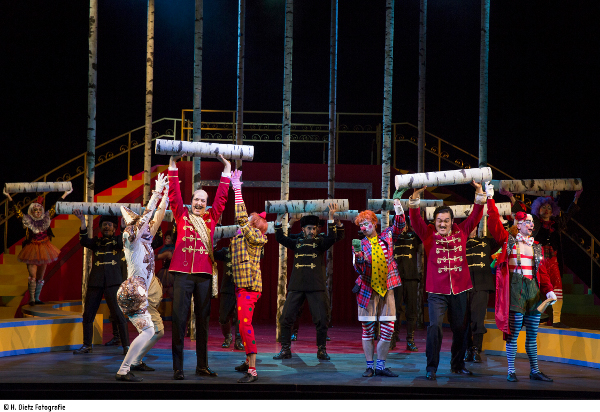 Setzt die Inszenierung nicht auf das Übliche, das im besten Sinne Routinierte, das beim Publikum dieses Abends gut ankommt, so findet sie tatsächlich zu eigenen Deutungen. Das erste Liebesduett zwischen Fedja Palinski und Fedora Palinska wird nicht herausgebrüllt, sondern ist eher, weil’s doch „wirklich“ um die Liebe geht, also „pour l’amour“, von der Melancholie des Verzichts geprägt. Statt „Mädels im Trikot“, auf die der Connaisseur gehofft hat, gibt’s Clowns zu sehen, und wenn die Husaren ihren berüchtigten und nicht erst seit der MeToo-Debatte problematischen Vergewaltigungsmarsch anstimmen, haben sie größte Schwierigkeiten, die Birkenstämme zu heben, die ihnen gerade leichthändig von der Circuscompagnie überreicht wurden: Offensichtlich „kriegen sie ihn“, trotz präpotentem Gehabe, „nicht hoch“. Kein Wunder, dass Thilo Andersson hier mit voller Absicht nicht wie üblich den Komiker markiert, sondern den intriganten Großfürsten als durch und durch ernste, unangenehm beglatzte Figur auf die Bühne stellt. Der feine Schluss des ersten Teils aber heißt: Tanz und Kuss. Und über allem wabert der ewige Nebel.