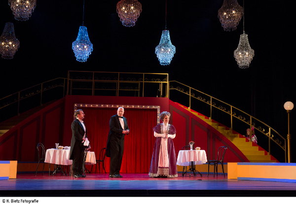 Und der Pfiff! Denn Markus Gruber hat als „Sohn des Erzherzogs Karl“, diesem Nebenzentrum der Verwirrungen, denen am Ende der Intrigant selbst zum Opfer fällt, einen komischen, extrem wienerisch inspirierten elan vital, der das Publikum rockt. „Komm mit nach Budapest“: Es wird zum Klatschmarsch im Schlussapplaus, der auch daran erinnert, dass eine gelungene Operetten-Aufführung auch vom Buffopaar abhängt. „Lise, Lise, komm mit mir auf die Wiese“ – diesem herzigen Walzer sich zu entziehen ist ebenso unmöglich wie von den lyrischen Höhepunkten des „Hohen Paars“ nicht berührt zu werden, obwohl Sophie-Magdalena Reuter eine extrem jugendliche, ja fast noch mädchenhafte Fürstin spielt, die im dritten Akt plötzlich wie eine Halbweltdame der Zwanziger am Tisch des „Erzherzog Karl“ ihren Champagner trinkt: auch sie eine Art Außenseiterin, die lieber einen scheinbaren Gaukler zum Mann nimmt als sich auf die Konventionen eines untergehenden Adelshauses zu versteifen.