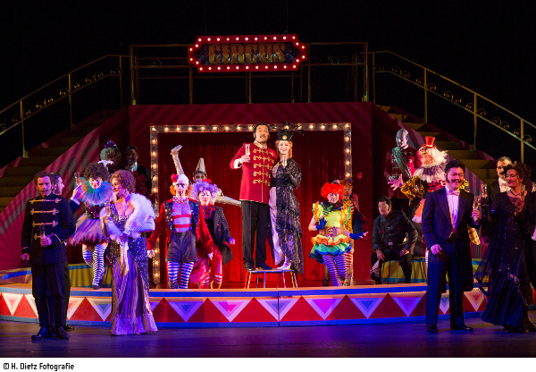 Das Ganze soll in einem Zirkus spielen, der abgerissen werden soll – die Idee bleibt ein Vorwand für die pure Dekoration, was poetische Szenen nicht ausschließt: es ist in der Tat sehr schön, wenn eine bunte Clownsfrau den Tenorhelden bewundert, der gerade sein Auftrittslied, diese Operettenversion des „Lache, Bajazzo“, zu singen hat. Dafür begleiten neun schwarzgewandete Herren (nicht im Frack, sondern in ihren schneidigen Circusuniformen) den Sopran. Sophie-Magdalena Reuter und Minseok Kim harmonieren in ihren Duetten denn auch prächtig; man hört schon, dass sie, nur sie, zusammen gehören, auch wenn der Tenor ein bisschen braucht, um sich auf seine schöne Höhe und in seine Sicherheitszone zu singen. Unterstützt werden sie übrigens von einem Orchester, das zu großen Teilen unter einem Deckel sitzt. Nun ja, Bayreuth ist nur 50 Autominuten entfernt… Trotzdem hat, man muss es leider wieder schreiben, Yvonne Prentki, die die Wiener Hundedresseuse spielt (leider ohne Hunde, aber auch Pferde sind auf dieser Bühne nicht zu sehen), wieder Schwierigkeiten, sich vokal bemerkbar zu machen. Diese Stimme muss einfach noch dynamisch wachsen, bevor man Endgültiges über sie sagen kann.