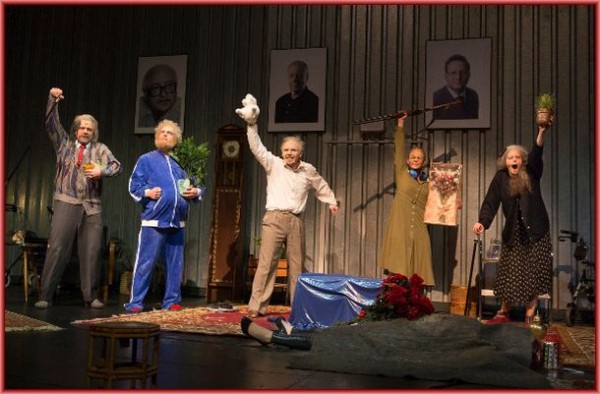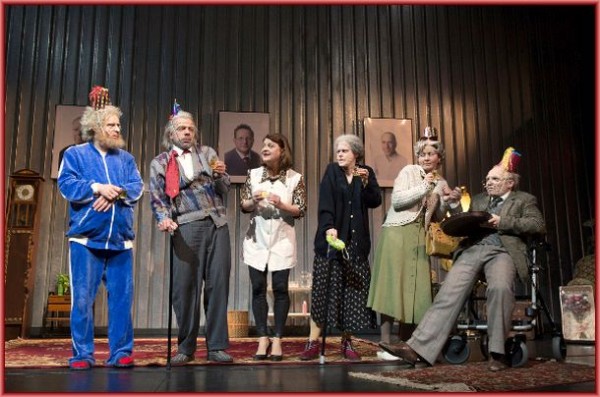 Nein, sie klatschen nicht in die Hände, aber sobald die Betreuungskraft den Raum verlassen hat, werden sie plötzlich zu altgewordenen, doch quicklebendigen Rockern. „I love Rock’n Roll“ führt die Suite von Schlagern an, die Erik Gedeon zusammengestellt und Michael Falk, der Mann in den Puschen, arrangiert hat. Ganz wie in einem Liederabend von Franz Wittenbrink werden unter der Regie Kristoffer Keudels die separaten Nummern mit einer schlichten, doch herzzerreißend komischen und melancholischen Geschichte versehen. Es passiert eigentlich nicht viel in diesem Künstleraltersheim, in dem die Bilder der drei letzten Intendanten des Theaters Hof und des dienstältesten Schauspielers (und nunmehrigen Kantinenchefs) Peter Kampschulte die Wände zieren – aber was passiert, ist kurzweilig. Man schlägt sich und verträgt sich, man lebt seine sexuellen Sehnsüchte, seine Bosheiten und seine Zärtlichkeiten aus. Die Charaktere krachen aufeinander: die ehemalige Revoluzzerin Frau Leinweber, die zarte Frau Schmitz, der lustige Herr Bänsch, der kräftige Herr Bals und der ehemalige Tragiker Herr Bregenzer.