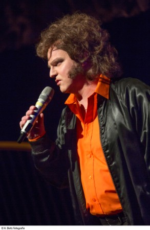 Was hier am Abend passiert, ist im wahrsten Sinn des Wortes phänomenal. Die wunderschöne Paradoxie besteht darin, dass wir natürlich wissen, dass die wunderbare Susanne Mucha die wunderbare Marianne Rosenberg mimt, wenn sie gestengleich, kostümlich identisch und stimmlich stark angenähert „Er gehört zu mir“ singt. Aber da sie es so singt und da sie annähernd so aussieht wie Marianne Rosenberg in der Show von anno 1975, und da man alle Stars dieses Abends dank Youtube mit ihren Vorbildern vergleichen kann, stellt man nachträglich fest, dass die Hofer Show umso origineller ist, desto kopierter sie angelegt wurde. Gerade weil Ralf Hocke den Tony Marshall mit seinem grotesken gelbschwarzen Babyanzug und -gesicht (mit spitzem Monsterkragen!) 1:1 bringt, hat man seinen Spaß. Gerade weil Marina Schmitz als langhaariges trauriges Gitarrenmädchen das Lied von Conny Kramer so schlicht singt wie die Juliane Werding von Anno dazumal und auf jegliche Variation verzichtet wird, merkt man etwas Echtes in diesem eigentümlichen Musiktheaterabend – und man merkt, wie gut die Schlager der 70er und 80er Jahre doch eigentlich waren. Denn wo gibt’s heute noch einen Drafi Deutscher, der wie Andreas Bühring das Lied von der ewigen Liebe singt? Wo gibt es etwas so offenkundig Blödes und doch irgendwie Originelles wie Stephan Remmlers „Da Da Da“, das von einem knochentrockenen Marco Stickel angestimmt wird? Wo gibt es noch so schönen deutschen Country wie Truck Stops „Take it easy“, das von Volker Ringe , zusammen mit der Band des Abends (