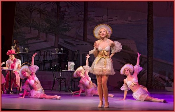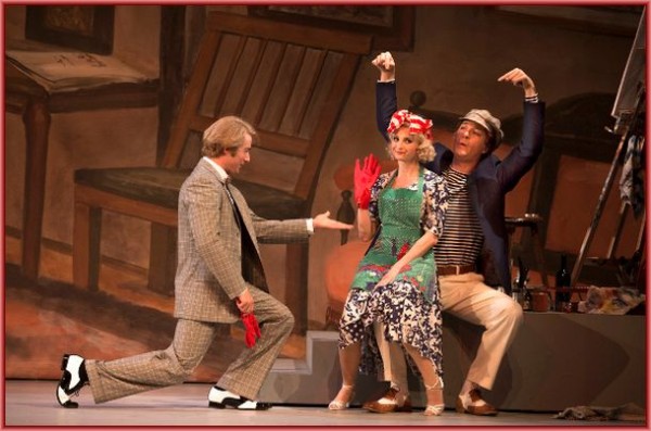 Der Regisseur Ivan Alboresi, der Dirigent Roland Vieweg, die Choreographin Barbara Buser, der Bühnenentwerfer Herbert Buckmiller und der Kostümgestalter Götz Lanzelot Fischer setzen ganz auf den durchaus eleganten Charme, nicht das Grauen der späten 30er Jahre. Dass die bühnenrahmenden Passepartouts, in denen sich die Prospekte und Bilder befinden, konsequent schief stehen, kann schon als Interpretation der aus den Fugen geratenen Zeit gedeutet werden, aber das war es denn schon mit der Zeitkritik. In Wahrheit genügt es, die relativ banale Liebes- und Intrigengeschichte um den Maler einer zunächst anonymen „Maske in Blau“ und seiner Geliebten, einer südamerikanischen Donna (Sonja Westermann erfreut Auge und Ohr), samt mehr oder weniger komischer Nebenfiguren – unter denen die Bayerische Bierwirtin alias Marianne Lang herausragt, die als Marchese Cavalotti auch eine Art Prinz Orlowsky gibt – jener Dramaturgie auszusetzen, die Musik und Tanz so souverän vorgeben.