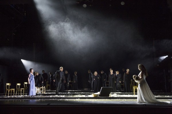 Minseok Kim gestaltet den Jason mit farbenreichem Tenor und überzeugt mit fragil erscheinenden Piani, seine Ausbrüche allerdings geraten bisweilen eine Spur zu grob. Vom König Créon von James Tolksdorf hätte ich mir neben erhabenem Herumstolzieren ein wenig mehr vokale Wucht gewünscht, Yvonne Prentki gestaltet seine Tochter Dircé hingegen vollends überzeugend mit müheloser Geläufigkeit und zarten Höhen. Stefanie Rhaue legt Medeas Gefährtin Néris eher mütterlich an, gefällt mir aber dabei gut mit ihrem nuanciert eingesetztem Mezzo. Dem Chor kommt in der Medea eine besondere Rolle zu, gerade im Regieansatz von Lothar Krause. Roman David Rothenaicher hat die Damen und Herren exzellent vorbereitet auf diese wichtige Aufgabe und so überzeugt der Opernchor, ob singend oder deklamierend, auf ganzer Linie. Angesichts der Tatsache, dass es sich bei allen Sängerinnen und Sängern um Rollendebütanten handelt, ist die vokale Gesamtleistung noch bemerkenswerter.