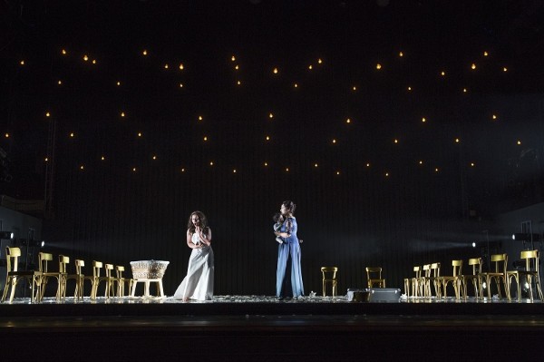 Natürlich lädt die erste Regiearbeit in einem sanierten Theater mit modernisierter Bühnentechnik dazu ein, die neuen, eindrucksvollen technischen Möglichkeiten zu zeigen. Das tut Lothar Krause zusammen mit der Bühnen- und Kostümbildnerin Annette Mahlendorf auch ohne Zweifel – und dennoch gerät ihre Lesart nicht zum Selbstzweck. Vielmehr verdichten die beiden die Geschichte rund um die Titelfigur. Gold ist omnipräsent in den Kostümen und den wenigen Requisiten am gestrigen Abend, die Bühne selbst in ihrer Wandelbarkeit genügt als Bühnenbild, eindrucksvolle Lichtregie schafft Stimmung und Stimmungen; die Hauptprotagonisten tragen historisierende Gewänder, ohne dabei explizit auf eine Zeit Bezug zu nehmen. Doch anhand der Farbgebung ist klar, dass Medea und ihre Gefährtin Neris nicht dazu gehören. Das sagenumwobene Vlies wird als stilisierter Widderkopf kurz gezeigt, doch alsbald durch das wahre Zentrum der Geschichte ersetzt. Medea ist nicht nur Triebfeder des Geschehens, sondern der Mittelpunkt von allem, um den auch der beinahe gemäß der griechischen Tragödientradition eingesetzte Chor kreist. In immer wieder eingespielten Videos von Kristoffer Keudel werden Hintergründe und Zusammenhänge deutlich; die hätte es aber wegen der klaren Erzählweise Krauses und der eindrucksvollen Bilder, die ihm auf den neuen Brettern gelingen, kaum gebraucht.