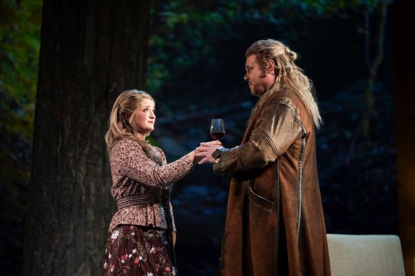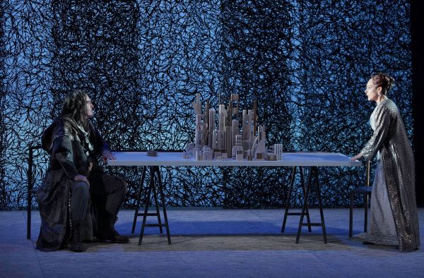 Im 2. Bild sehen wir in einem eleganten Salon diverse Holz-Modelle des ultramodernen Walhall, welches in der „Walküre“ vergrößert im Hintergrund mit einem riesigen Raffinerie-artigen Industriekomplex als Machtbastion überhöht aus dem Boden schießt. Die beiden Riesen treten in einem ebenso überraschenden wie interessanten Outfit auf: Sie sind als große transparente Puppen dargestellt, mit bedrohlichen Schädeln und kräftigen Armen – eben das, worauf es beim Bau Walhalls ankam. Die Sänger stehen jeweils hinter diesen Puppen. Die Großfiguren und die Choreografie der Figurenspieler, die sie bewegen, liegen in den Händen von Marc Schnittger. Timo Riihonen ist ein klangschöner Fasolt, der in der „Walküre“ auch einen starken Hunding singt und spielt. Marek Wojciechowski ist ein etwas grober Fafner, was aber zu seiner Rolle passt. Agnieszka Hauzer, die tags darauf die Tosca singen sollte, ist eine stimmliche Luxusbesetzung für die Freia.