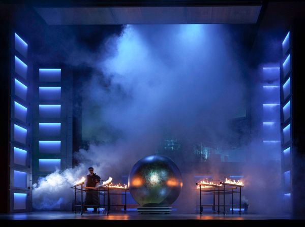 Es beginnt schon im Vorspiel des „Rheingold“ mit der Videoprojektion (Konrad Kästner) großer Planeten und der Erde im Besonderen, die sich effektvoll im Raum bewegen und damit universalen Herrschaftsanspruch dokumentieren. Wotan wird hier als eine schillernde Figur dargestellt, im „Rheingold“ noch als hippieartiger und somit weitgehend unschuldiger Visionär, der den globalen Herrschaftsanspruch anmeldet und erst mit dem brutal gezeigten Raub des Rheingolds von Alberich seine Unschuld verliert. Indem er eine Weltordnung aus der Urmasse der Welt schaffen kann, durch die Versiegelung der Gesetze in seinem Speer, ist Wotan in der Rolle des Politikers, wie auch Udo Bermbach ihn nennt.