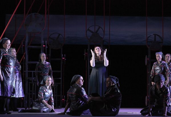 Großartig an diesem Abend das Philharmonische Orchester, das fein abgestimmt unter der Leitung des Generalmusikdirektors Georg Fritsch um einen rechten Wagner-Sound bemüht ist. Das Bühnenbild von Rifail Ajdarpasic ist geheimnisvoll mit sich drehenden Mühlen, Kraft übertragenden Seilen und Rädern, die an die Stelle der Spinnräder treten. In die runde Ensembleleistung der Stammsängerinnen und -sänger fügen sich die renommierten Gäste – deren saubere Aussprache beeindruckt – nahtlos ein.