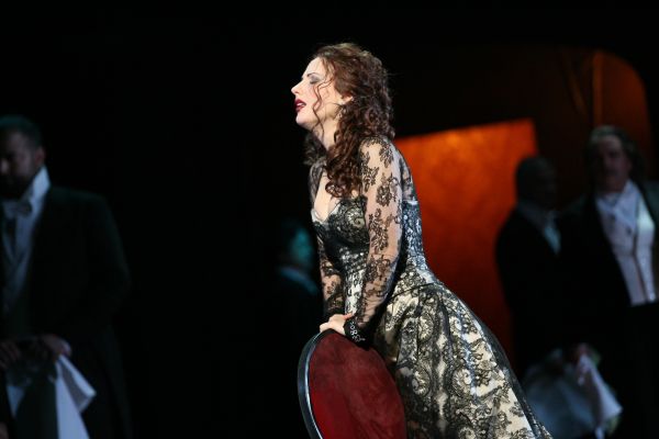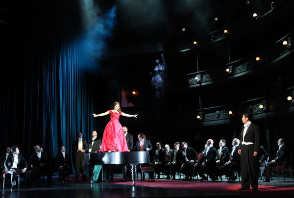 Regie führte Uwe Schwarz, der die Produktion nach dem tragischen Tod von Thomas Wünsch übernahm. Zusammen mit dem Bühnenbildner Heiko Mönnich gelang eine perfekte Symbiose zwischen traditionell und modern. Oeffnet sich der Vorhang, sieht man ein komplettes Opernhaus mit Rängen, Parkett und Bühne, das aber schon sehr viel bessere Zeiten erlebt haben muss. Alles ist dunkel, morbide und angeschlagen. Ein toller Einfall ist die Tanzeinlage zur Ouvertüre (Sonia Dvorak und Sebastian Grundler), die perfekt zur Musik passt und schon etwas von Abschied und Tod suggeriert. Und die Leistung der Regie besteht darin, auch abgebrühte Opernvielseher und Nörgelkritiker so zu fesseln, dass man gespannt und ergriffen der Handlung folgt. Die Personenführung war sehr präzise und überlegt. Grossen Beitrag daran hat auch die ausgefeilte Lichtregie. Die Szene im 3. Akt, in der man durchs Fenster die Karnevalsmusik hört, habe ich noch nie so packend gesehen: die vorher trist- dunkle Bühne in grelles Rot getaucht, Violetta reglos auf dem nackten Boden, dazu die zwei Tänzer mit einer geradezu gespenstischen Einlage.
