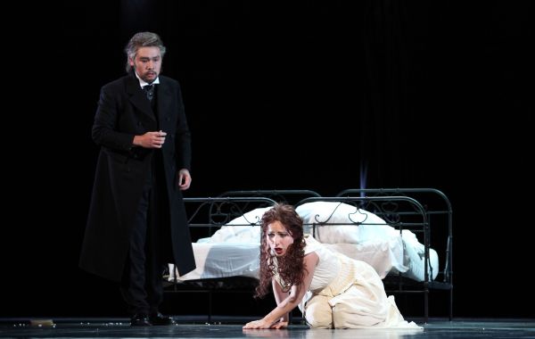 Nun wird natürlich auch gesungen, aber wie! Ekaterina Isachenko, dem Kieler Publikum als Gast in diversen Produktionen bekannt, lieferte sängerisch und schauspielerisch eine Glanzleistung ab. Wie sie es schaffte, diese Frau zwischen unbändiger Lebensgier und Krankheit dem Publikum nahe zu bringen, verdient Hochachtung. Hinzu kommt ihr erstklassig geführter Sopran, der jede Tücke der Partitur meisterte. Ihr „E strano“ geriet zu einem der Höhepunkte des Abends. Bei ihrer Sterbeszene, eingewickelt in den heruntergerissenen Bühnenvorhang, herrschte atemlose Stille im Opernhaus. Erst nach einer ergriffenen Pause brach der Beifall los.
