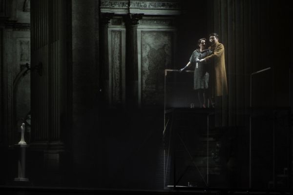 Die Kieler Tosca-Inszenierung des vor allem durch seine Arbeit an der Comédie-Francaise in Paris weltweit wahrgenommenen Regisseurs Lukas Hemleb besticht durch eine Schlichtheit in Personenregie und ein spartanisches Bühnenbild, das im Wesentlichen für alle drei Akte durch Videoproduktionen der italienischen Videokünstler-Göße Luca Scarzella, der die Tosca schon in Osaka, Turin und nun Kiel bebildert, Räume schafft, die uns die Handlung ganz konkret vor Augen stellen. Im ersten Akt wird durch die Produktion der Kirche Sant’Andrea della Valle auf einen Schleier, hinter dem die Sänger agieren die Illusion geschaffen, dass sie sich tatsächlich in der großen, dunklen Kirche befinden. Im zweiten Akt ist der Schleier weg und auf die Rückwand wird eine Front des Palazzo Medici projiziert, der in einer Endlosschleife synchron mit der Bewegung der Drehbühne von links nach rechts fährt. Dazu gibt es auf der Bühne nur ein grünes Sofa und ein Tisch. Im dritten Akt sieht man auf den wieder abgesenkten Schleier projizierte Wolken, die ebenso auf die Rückwand projiziert wird. So entsteht kein Tableau, sondern ein Raum, in den man seiner dreidimensionalen Wirkung wegen hineingreifen möchte. Dazu neben Bildern als Erinnerungen an das was geschah, Bilder der Engelsburg.