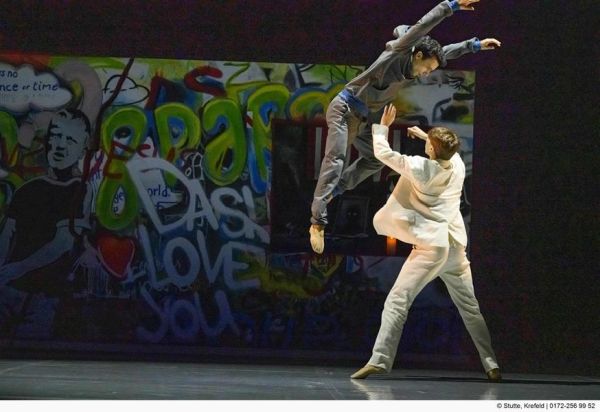 Weniger harmonisch geht es in „Respect Bro“ zu. Inspiriert durch den Fall George Floyd schuf Takashi Kondo zur Musik von Arvo Pärt (Fratres für Violine und Klavier) ein Werk für zwei Tänzer die nicht nur in der Rolle von Polizist und Opfer verschiedene Formen von Gewalt und Unterdrückung tänzerisch darstellen. Ein Darsteller im weißen Anzug, der andere im dunklen Kapuzenpullover, so scheinen die Rollen vor der großen Graffitiwand im Hintergrund zu Beginn klar verteilt zu sein. Doch im Verlauf des Werkes verschwimmen diese Grenzen zusehends, denn Respekt sollte nicht von der Position einer Person, vom Alter, Geschlecht oder Rasse abhängen. Für diese körperlich extrem anstrengende Choreografie voller Konfrontationen bekamen Francesco Rovea und Radoslaw Rusiecki einen besonderen Beifall vom Publikum.