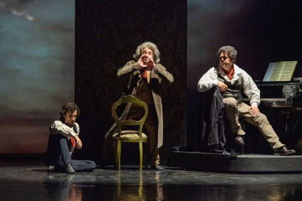 Mit Michael Grosse übernimmt der Intendant des Hauses die Rolle des alten Beethoven. Eine Rolle, in der er mit feinem Witz als eine Art Moderator durch den Abend führt. Immer wieder kommentiert er das Geschehen oder steuert Zitate des Originals aus alten Briefen bei. Am Klavier begeistert André Parfenov das anwesende Publikum mit seiner Musik und stellt einmal mehr seine Qualitäten unter Beweis. Er spielt unter anderem Auszüge aus mehreren Klaviersonaten Beethovens. Aber auch Johann Sebastian Bachs Wohltemperiertes Klavier 1. Teil, Präludium Nr. 15 G-Dur ist ebenso vertreten wie Parfenovs eigenes Boogie-Woogie und Improvisationen. Auch bei den eingespielten Stücken bringen sich Wolfgang Amadeus Mozart, Grigoras Dinicu und John Cage in den Abend ein, allerdings stehen auch hier selbstverständlich die großen Werke von Ludwig van Beethoven im Vordergrund. So ist es am Ende auch die „Ode an die Freude“ die im Finale den Traum auf eine Welt, in der alle Menschen in Frieden und Freiheit leben können musikalisch begleitet. Als junger Beethoven versprüht Balletttänzer Alessandro Borghesani ein unheimliches Temperament und eine enorme Lebensfreude. Gelungen sind auch immer wieder die Momente, in denen er von seinem in die Jahre gekommenen „Ich“ an die Hand genommen und durchs Leben geleitet wird.
