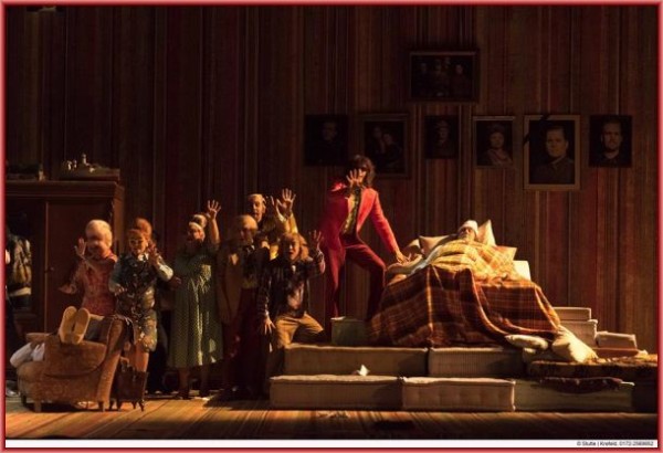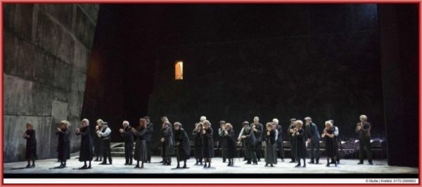 Eindrucksvoll prägt sich bei „Cavalleria“ zunächst einmal das komplett schwarze Bühnenbild vonSIEGFRIED E. MAYER ein: hohe Rückwand mit hell erleuchteter Marienstatue als Blickfang, davor auf Stühlen sitzend die müden Männer des Dorfes, welche – wie ihre Frauen auch – an nichts anderem mehr festklammern können als an religiösen Ritualen. Vergreist sind sie alle und tapsen herum, als seien sie gleichzeitig mit Parkinson und Demenz geschlagen. Im Libretto heißt es allerdings an einer Stelle „Ihr Schönen“. Freilich: auch eine jüngere Gemeinschaft kann bigott sein und würde eine entehrte“ Santuzza ebenfalls aus ihren Reihen verstoßen (Osterchor mit riesiger Bänderkrone). In dem Film „Alexis Sorbas“ (er war kürzlich im deutschen Fernsehen wieder mal zu sehen) wird das beispielsweise auf besonders niederschmetternde Weise gezeigt. Der Auftritt eines kinderhaften Engelchens zu Beginn und beim „Intermezzo sinfonico“ und andere figurale Erinnerungskonstellationen prägen die assoziativ durchsetzte Inszenierung von FRANCOIS DE CARPENTRIES Immer wieder.