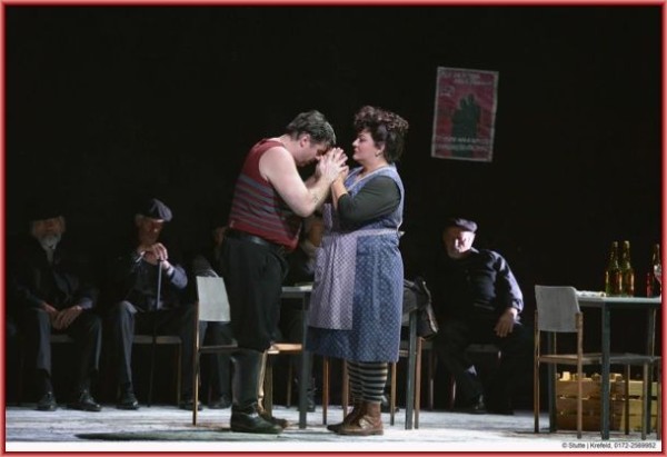 JANET BARTOLOVA ist (in der gesehenen Zweitaufführung) eine vokal weitgehend standfeste Santuzza (Eva-Maria Günschmann war in der Premiere zu erleben) und spielt ihre Partie mit starker dramatischer Präsenz. Die Bulgarin ist langjähriges Ensemblemitglied des Gemeinschaftstheaters Krefeld/Mönchengladbach (seit 1994/95) und war vor einigen Jahren so frei, sowohl Norma als auch Adalgisa in einer Produktion der Bellini-Oper zu gestalten.