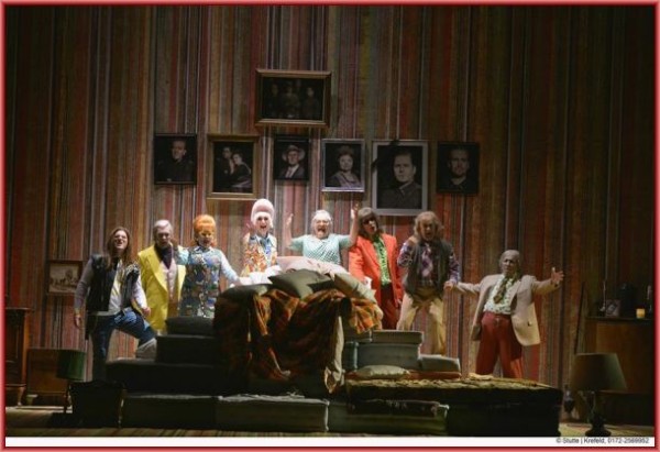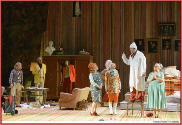 Für das Gemeinschaftstheater Krefeld/Mönchengladbach, welches jetzt „Schicchi“ mit „Cavalleria“ kombinierte, kam „Il Trittico“ nicht mehr infrage, wurde doch „Suor Angelica“ 2011 doch schon mit „Le Villi“ zusammengespannt. Als Zweiteiler hätte sich „Schicchi“ mit „Tabarro“ angeboten, wie anderswo häufiger geschehen. Aber man dachte ehrgeiziger. Von der Dramaturgin des Hauses scheint die Idee freilich nicht ausgegangen zu sein, sonst hätte sie sich im Programmheft geäußert. Vielleicht gab es eine Empfehlung von Opernintendant Andreas Wendholz, welcher 2011 noch als Dramaturg wirkte.
