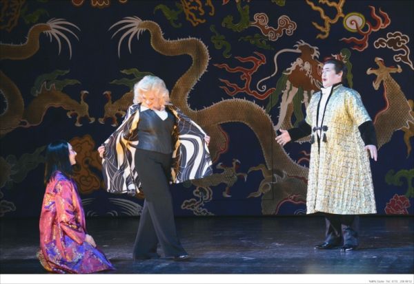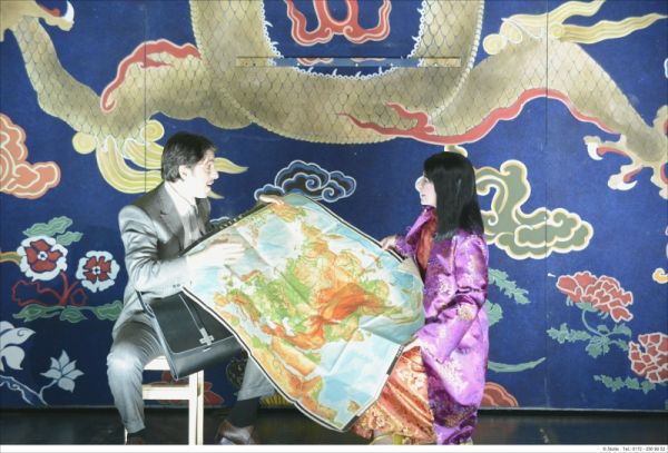 Markus Meyer hat für den Wiener Akt zwar eine etwas düstere, an ein gediegenes Bestattungsinstitut erinnerndes Bühnenbild entworfen, auch die Wiener Gesellschaft aus manisch maskierten Herren und angejahrten Witwen reißt das nicht heraus; doch der chinesische Akt erfreut das Auge mit großer Farbenpracht, Akrobatik, sowie Feuer- und Bändertänzen. Die Hofintrige ist auf die gespenstige "letzte Kaiserin von China" von Rosemarie Weber beschränkt. Dann folgt die tränenselige Trennung bis zu Sou-Chongs "Immer nur lächeln".