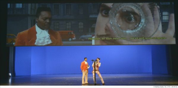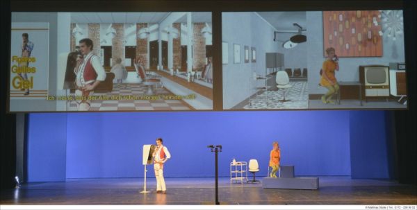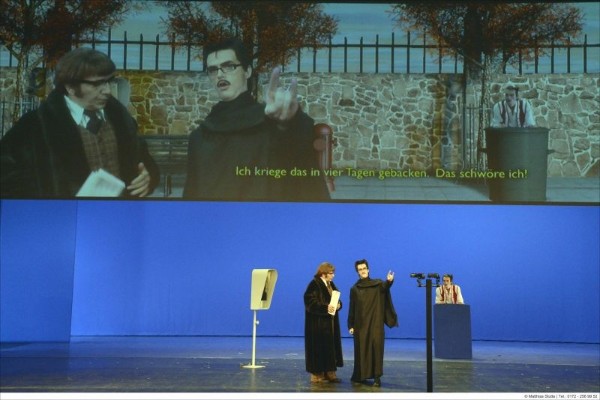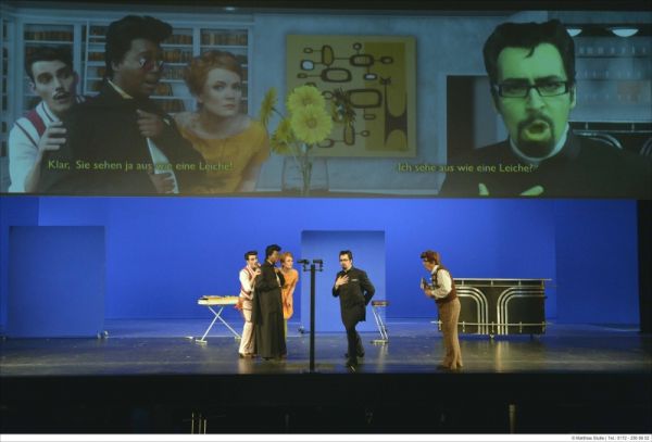 Ein wirkliches Szenenbild gib es nicht mehr. Rensburg und STEVEN KOOP lassen das Geschehen mit einer Livekamera einfangen, bei extremer Nähe der Sänger immer wieder auch in Großaufnahme. All das wird auf einen rückwärtigen, hoch hängenden Prospekt geworfen und mit Interieur- und Outdoor-Bildern nach dem Prinzip des Prager Schwarzen Theaters gemischt. Das ergibt witzige Verdoppelungen des realen Bühnenspiels. Manchmal könnte man ein Zuviel des Guten empfinden, etwa gleich bei der Ouvertüre, die dazu dient, Rossini höchstpersönlich in kulinarische Aktion treten zu lassen. Die Titeleinblendungen von „Aureliano in Palmira“ und „Elisabetta d’Inghilterra“ zeigen bei dieser Gelegenheit andererseits, dass hinter all den Verrücktheiten eine profunde Werkkenntnis steckt: die Ouvertüren sind nämlich komplett identisch.