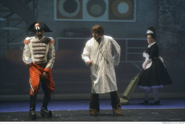 Dass die Partie der Rosina nicht historisch streng mit einem Mezzo besetzt ist, rechtfertigt Rensburgs gänzlich unakademische Arbeit durchaus. SOPHIE WITTE macht mit ihrem glasglockenklaren, beweglichen und höhensicheren Sopran einen anderen, aber trefflichen Typ aus dem Rossini-Girl. Schlank und fesch sieht sie auch noch aus. Dies gilt auch für RAFAEL BRUCK in der Titelpartie. Ein köstlicher Hallodri, der seine (vermutlich mit „Figaros geilem Gel“ gepflegte) Schmachtlocke sorgsam in Schuss hält, gelenkig als Darsteller, baritonal unbeschwert (bei leichter Anstrengung in extremer Höhenlage). Aus dem Basilio macht ANDREW NOLEN einen schwarz-priesterlichen Dämon und lässt dabei seine virile Stimme schon mal ironisierend in Kellerbereiche abdriften. Der bewährte, vielseitige HAYK DÈINYAN gibt den Bartolo reichlich bekloppt, um es im Jargon der Übertitel zu formulieren. Last not least. DEBRA HAYS, als Soubrette und lyrischer Sopran seit 1991 zum Ensemble gehörend, spielte im „Figaro“ die Marcellina und ist jetzt folgerichtig die Berta im „Barbier“. Ihre Arie serviert sie, im Arm eine Weinflasche aus der Klospülung, mit vitalem Despina-Charme und lässt sich ein paar zusätzliche Höhen-Staccati nicht entgehen.