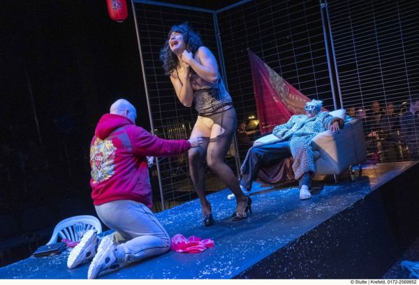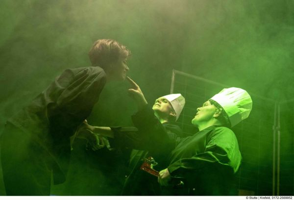 Die sehr gelungene Neuinszenierung in Krefeld stammt von Petra Luisa Meyer . Die Zuschauer sitzen hierbei mit auf der Hauptbühne, jeweils rechts und links eines langen Steges. Ein Konzept welches bereits bei „Der Mann, der seine Frau mit einem Hut verwechselte“ sehr gut funktionierte, da man den Darstellern sehr nahekommt. Und dies ist bei diesem dramatischen Werk ein großer Vorteil, wirkt das Geschehen so doch besonders intensiv auf den Zuschauer ein. Erst recht, mit einer so grandiosen und spielfreudigen Besetzung wie in Krefeld. Panagiota Sofroniadou aus dem Opernstudio Niederrhein spielt den Kleinen, mit einer ganz besonderen Hingabe. Zudem hat Sie in der vorletzten Szene noch die ergreifende Arie „Die Heimreise“ als Monolog zu singen, wo sich der Asiate auf seine letzte lange Reise begibt. Als seine Schwester und Grille zeigt James Park einmal mehr sein schauspielerisches Talent, wie er zum Beispiel die asiatische Kellnerin verkörpert ist allein ein Besuch der Vorstellung wert. Auch gesanglich wie immer tadellos. Dies gilt auch für Rafael Bruck , der als Asiate, chinesischer Onkel und als blonde Stewardess Inga auftritt. Susanne Seefing verkörpert insgesamt 5 Rollen, wobei hier die Ameise besonders hängen bleibt. Ebenfalls 5 Rollen verkörpert Peter Koppelmann , der bereits am Theater Koblenz bei diesem Werk mitwirkte. Besonders bemerkenswert hierbei, wie auch optisch unterschiedlich gerade seine Rollen daherkommen. Wenn man es nicht besser wüsste würde man fast denken hier sind verschiedene Darsteller im Einsatz. Dies liegt auch an den interessanten Kostümen die Dietlind Konold hier geschaffen hat. Sie geben die verschiedenen Rollen gut wieder, kein sonderlich leichtes Unterfangen hinsichtlich der Tatsache, dass oft sehr schnelle Kostümwechsel notwendig sind zwischen den 21 Szenen des Werkes. Unter der musikalischen Leitung von