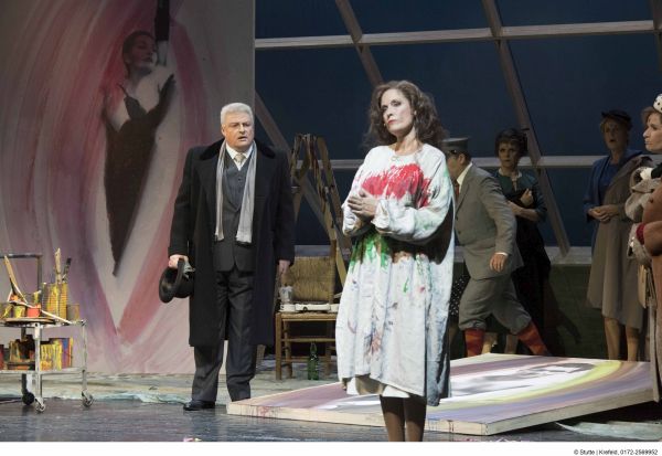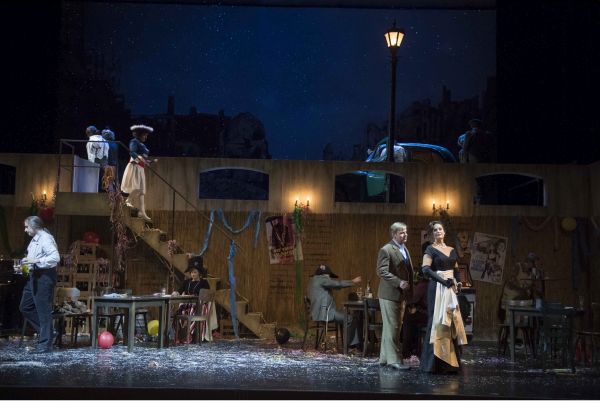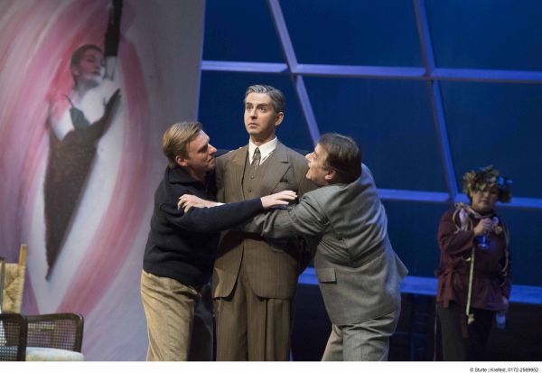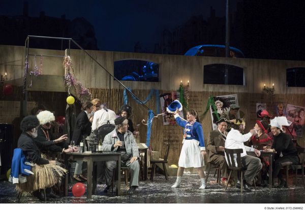 Das der Abend mit etwas über drei Stunden auf den ersten Blick relativ lang wirkt, ergibt sich auch durch zwei Pausen, da jedem der drei Akte ein eigenes großes Bühnenbild gewidmet ist. Ist es im ersten Akt die vom Bühnenbildner Siegfried E. Mayer liebevoll gestaltete Künstlerkneipe, die in einem Kellergeschoss untergebracht ist und über der auf der hochgefahrenen Hinterbühne das Straßengeschehen samt liegen gebliebenem Auto dargestellt wird, wird im dritten Akt die Hotellobby mit angrenzendem Speisesaal raumfüllend und detailreich dargestellt. Sehr schön hierbei auch einige Anspielungen auf das bekannte „Dinner for One“ samt Fellteppich. Auch das Künstleratelier mit großen Dachfenstern und Außenbalkon im zweiten Akt ist opulent ausgefallen, einziger Kritikpunkt hier, dass es doch etwas sehr modern für die gewählte Zeit daherkommt. Aber darüber lässt sich an einem ansonsten rundum gelungenen Abend auch leicht hinwegsehen.