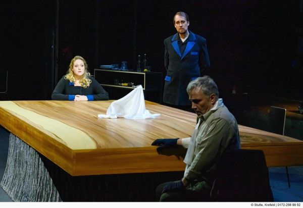 Passend zur kleinen Besetzung hat Ulrich Proschka ein szenisches Arrangement entworfen, das als kleines Kammerspiel daherkommt und sich ausschließlich in Hundings Heim abspielt. Selbst das Schwert Notung ist hier zu finden und befindet sich inmitten eines großen Eichentisches. Bei seiner Inszenierung konzentriert sich Proschka vor allem auf die Beziehung des Geschwisterpaares, die meist nachvollziehbar beleuchtet wird. Das Bühnenbild und die passenden Kostüme von Udo Hesse sind schlicht, aber passend und runden das positive Gesamtbild der Inszenierung ab. Auch gesanglich erwartet den Besuch ein gelungener, wenn auch sehr kurzer, Opernabend. Markus Petsch glänzt mit seinem brillanten Tenor als Siegmund. Nicht nur bei „Wälse, Wälse, wo ist mein Schwert“ erfüllt seine Stimme den ganzen Theatersaal bis in letzte Reihe. Als Sieglinde kann Dorothea Herbert ebenfalls überzeugen. Abgerundet wird das Trio von Matthias Wippich als Hunding, der gesanglich mit seinem tiefen Bass ebenfalls markante Merkmale setzen kann. Darüber hinaus kann er beim Schauspiel am meisten überzeugen. In nahezu jeder Szene ist ihm das Misstrauen und die Verachtung gegenüber Siegmund im Gesicht abzulesen. Auch scheint er einen Verrat bereits zu ahnen, fühlt sich aber hoch überlegen, so dass er Sieglindes Schlaftrunk dann doch erliegt. „Hochmut kommt vor dem Fall.“ Saust es einem da schnell durch den Kopf.