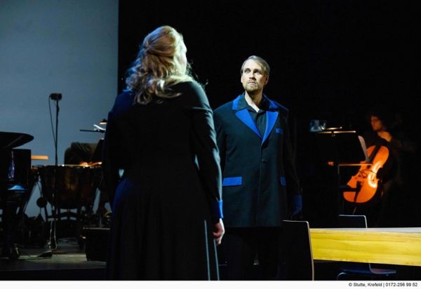 Bereits im vergangenen Herbst feierte in Krefeld der erste Akt der Walküre seine Premiere als kleine, komplett corona-taugliche Inszenierung. Gespielt wird der erste Aufzug der Oper in einer stark reduzierten Orchesterfassung für zwei Klaviere, ein Cello und Schlagwerk. Erstaunlich, welche Wirkung Wagners monumentale Komposition auch in dieser Form entfalten kann. Erik García Alvarez und Michael Preiser harmonieren an den beiden Klavieren sehr gut, Ghislain Portier spielt das Cello einfühlsam und Günther Schaffner lässt gleich zu Beginn der Aufführung die Pauke als ordentliches Gewitter erklingen. Im Hintergrund der Bühne erhellen Blitze das Dunkel der Nacht. Die musikalische Leitung des Abends liegt bei Andreas Fellner, der die vier Musiker gelungen durch die rund 70 Minuten leitet.