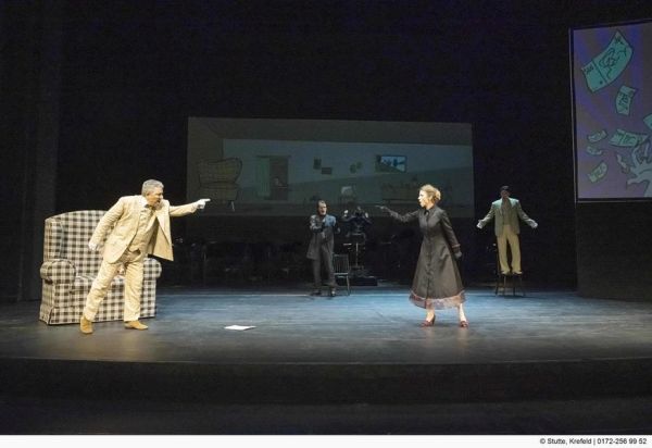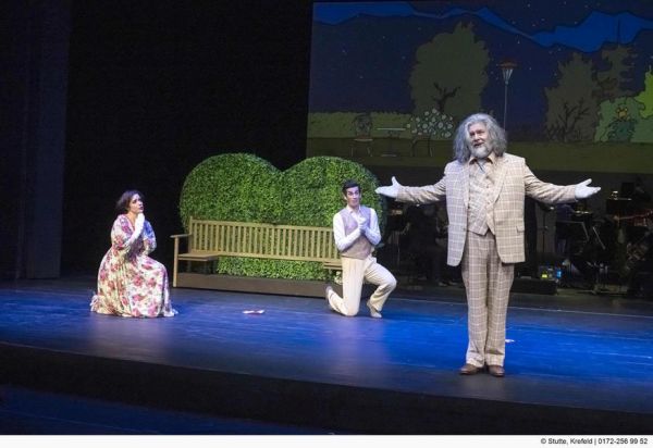 An sich war also alles für einen großen Premierenabend in Krefeld vorbereitet, doch leider wurde der Abend zu quälend langen 90 Minuten, an dem man am liebsten schon nach einer halben Stunde den Theatersaal verlassen hätte. Gleich zu Beginn der Vorstellung startete ein quälendes nicht genau definierbares Piep-Zisch-Geräusch in der rechten Hälfte des Theatersaals, welches sich mal lauter, mal etwas leiser durch die gesamte Vorstellung zog. Ob es nun durch einen Defekt an der Klimaanlage hervorgerufen wurde oder was auch immer die Ursache gewesen sein mag, es ist zu hoffen, dass die Ursache direkt im Anschluss an die Premiere gefunden wurde, damit die angesetzten Folgevorstellungen diesbezüglich störungsfrei über die Bühne gehen können. Einmal durch ein solches Geräusch gestört, fällt es leider sehr schwer sich auf das eigentliche Stück zu konzentrieren, egal wie sehr man sich auch bemüht. Besonders schade ist dies deshalb, weil die Darsteller allesamt eine ganz beachtliche Leistung ablieferten. Johannes Schwärsky spielt den alternden Don Pasquale ganz wunderbar, Guillem Batllori aus dem Opernstudio Niederrhein gibt den mit allen Wassern gewaschenen Doktor Malatesta, Woongyi Lee lässt den Ernesto mit schönem Tenor erklingen und Sophie Witte verleiht Norina mit ihrem Sopran den notwendigen Glanz. Gereon Grundmann hat als Notar und Faktotum nur wenige Töne zu singen, darüber hinaus darf er als eleganter Diener immer wieder Gegenstände auf die Bühne bringen und wegräumen. Gesungen wird in italienischer Sprache mit deutschen Übertitel, wobei einige deutsche Sprechtexte die Handlung erläutern, so dass dem Zuschauer trotz der Kürzung auf 90 Minuten (ohne Pause) eine komplette handlungsbasierte Fassung der Oper geboten wird.