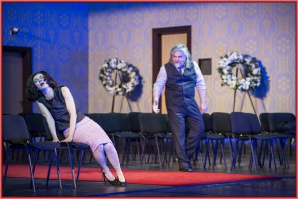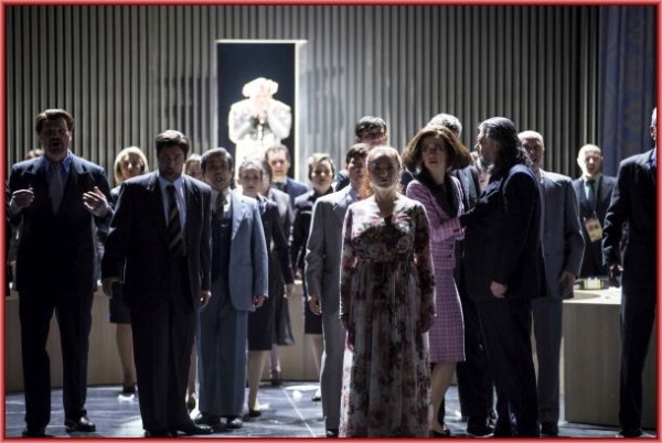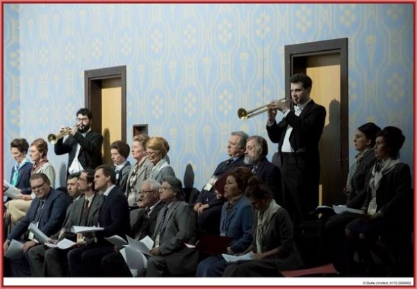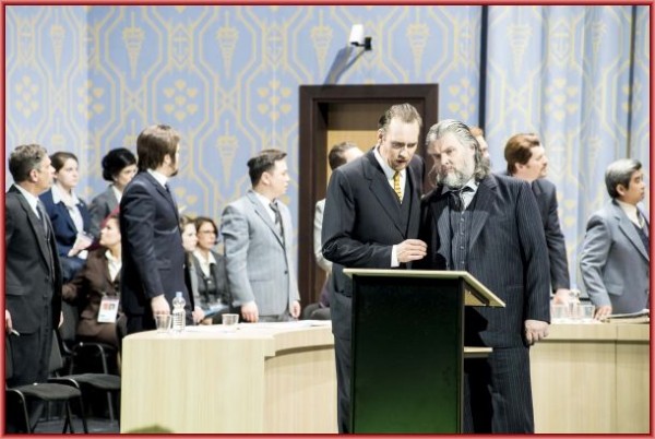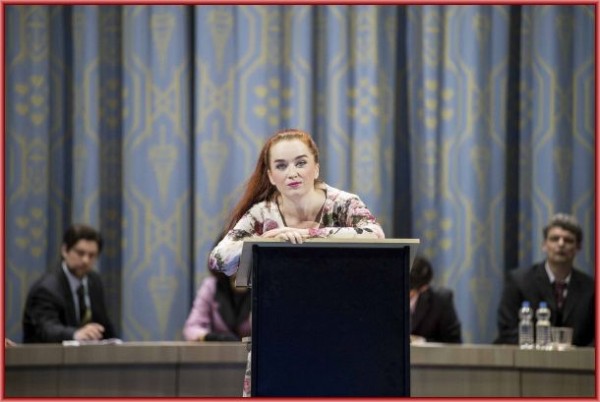 Leider findet sich das auf der Bühne (Tom Musch) doch nur recht bieder wieder. Die Angabe "Orientierung am Sitzungssaal der UN" ist schon hoch und weit hergeholt; sieht es doch eher, vor allem mit dem biederen Vorhang im Hintergrund – zumindest im ersten Akt – aus wie die Kulisse in einem Billigfilm von Ed Wood. Das Stuhlseminar im gleichen Einheitsbühnenbild (2. Akt) wirkt nicht nur trostlos langweilig, sondern auch ausgesprochen abtörnend zu der schönen romantischen Musik. Und zum dritten Akt fällt mir nur wieder Richard Wagner selber ein: