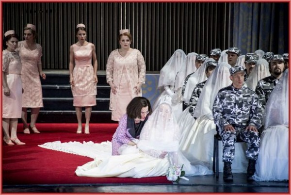 Militaria martialica all überall; sogar die Damen in den weißen Brautkleidern tragen zum "treulich geführt" Kalaschnikows. Ja, sie sind doch ein ganz schön militantes Völkchen diese Brabanter, in ihren schicken taillierten Kamuflasch-Uniformen (Ingeborgh Bernerth), rüde Soldateska, die nur auf einen Anführer gewartet hat.