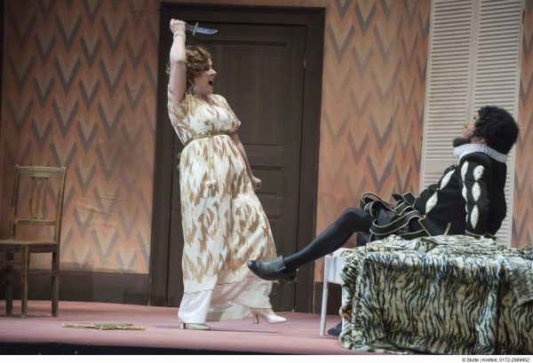 "Dio fulgor della bufera" mit Donner und Blitz im forte fortissimo des Originalklanges von Verdis OTELLO beginnt das Musical "OTELLO darf nicht platzen" – dazu winkt der Riesenchor des Theaters mit Wackelhänden wie in einer großen amerikanischen Revü-Nummer ins Publikum – natürlich in original klassischen Opernkostümen (der Riesenfundus des Krefelder Theaters lässt grüßen!). Alles erinnert irgendwie auf ganz wunderbare Weise an Otto Schenks Kultstücke, nämlich die Opernparodien Tosca auf dem Trampolin.