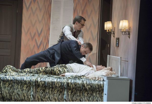 Auch hier geht es um den Minikosmos Musiktheater. Es geht um jene Menschen, die sich dort auf, vor und hinter der Bühne versammelt haben. Hauptperson ist der große Startenor Tito Merelli, der anfangs im Krefelder Theaterfoyer (was für ein schöner Einfall) noch diverse Autogramme gibt. Siehe Bild unten !