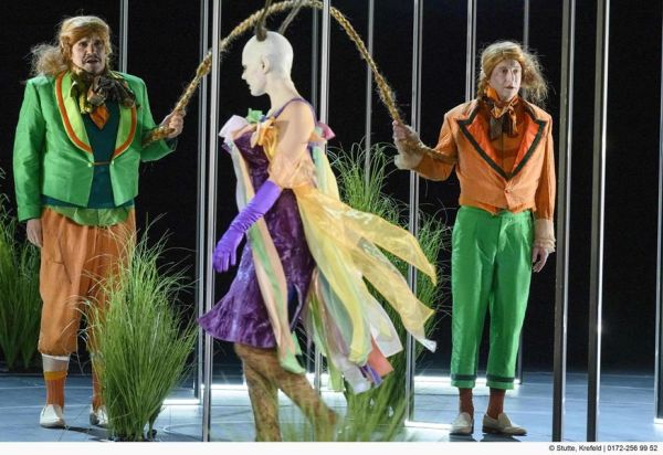 In diesen zehn Begegnungen geht es um die Beziehung von Mann und Frau, wobei es in fast jeder Szene auch zum Sexualakt kommt. Jede Szene ist hierbei mit der folgenden durch eine Figur verbunden. So trifft die Dirne erst auf den Soldaten Franz, der Soldat trifft dann in der zweiten Szene auf das Stubenmädchen Marie, dieses Stubenmädchen trifft auf einen jungen Herrn und dieses Spiel wiederholt sich solange bis ein Graf auf die Dirne trifft und der Reigen in dieser Szenen unterbrochen wird. Von einem der größten deutschen Theaterskandale wie bei der Uraufführung 1920 in Berlin ist man heutzutage weit entfernt, erst recht, wenn es beim eigentlichen Sexualakt in der Regel dunkel wird auf der Bühne. Allgemein ist es schwierig eine Produktion, bei der es vordergründig auch um engen körperlichen Kontakt geht, unter den aktuellen Corona-Abstandsgeboten zu inszenieren. Dies geling Maja Delinić allerdings recht gut, indem sie die Suche nach dem seelischen Kontakt in den Vordergrund stellt. Das Bühnenbild stellt hierbei eine recht kühle Spirale dar, die von kleineren Naturelementen wie Sträuchern etwas aufgelockert wird (Bühnenbild: Ria Papadopoulou). Die Kostüme von Janin Lang sind sehr phantasievoll gestaltet, allerdings setzt hier dann auch das große „Aber“ ein. Die teilweise extrem grotesken Überzeichnungen der einzelnen Charaktere machen es schwierig sich auf die Texte zu konzentrieren. Immer wieder erwischt man sich dabei, die gesamte Inszenierung in diesem Punkt nicht ernst zu nehmen. Wenn der Ehegatte beispielsweise von zwei Schauspielern gleichzeitig gespielt wird, die durch das Haar miteinander verbunden sind, ist das Kostüm zwar nett anzuschauen und die schauspielerische Leistung der beiden Darsteller beachtlich, aber insgesamt wirkt es durch die Überzeichnung nicht nur unrealistisch, sondern sogar fast etwas beliebig. Auch dass zwei Teufel nach einem Vorspiel laufend als Beobachter ins Bild huschen, bringt der Inszenierung ebenfalls keinen rechten Mehrwert. Dass das Finale den Zuschauer dann mit einem weiteren kleinen Fragezeichen zurücklässt, passt fast etwas zu diesem Theaterabend. Allerdings ist der musikalische Einsatz von Harfe und Horn als musikalischer Gegensatz dann wieder sehr gut gelungen (Musik: Clemens Gutjahr) und weiß durchaus zu gefallen.