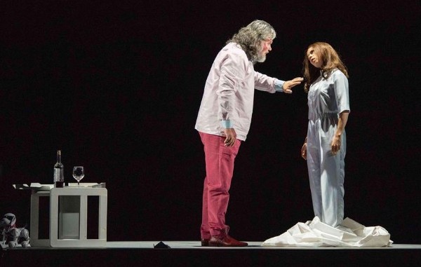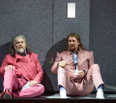 Sie erinnern den alten Sci-Fi-Fan irgendwie an die dreieckigen Raumschiffe, mit denen einst Major McLane in der Uralt-Fernseh-Serie Raumpatrouille zu tun hatte. Egal, was auch immer da drinnen ist, jedenfalls konsumieren Rigoletto und der Mörder Sparafucile (Bild rechts) später dasselbe Zeug, wenn sie auf der trostlosen hellerleuchteten Bühne konspirativ zusammenhocken. (Bild oben) "Also dieser Sparafucile sieht irgendwie aus wie ein schwuler Prince Charming!" tönt eine hinter mir sitzende Opernfreundin nicht gerade leise in des Ehegaten Ohr. Zustimmendes Nicken im Umfeld. Ich würde dem auch nicht widersprechen wollen.