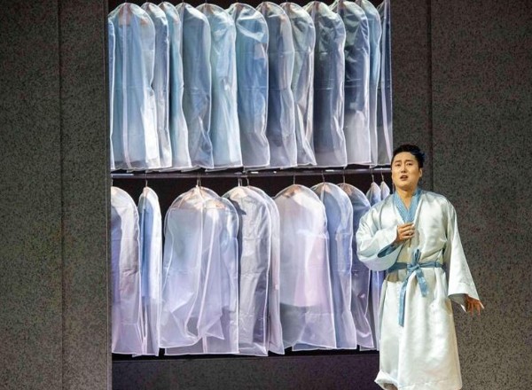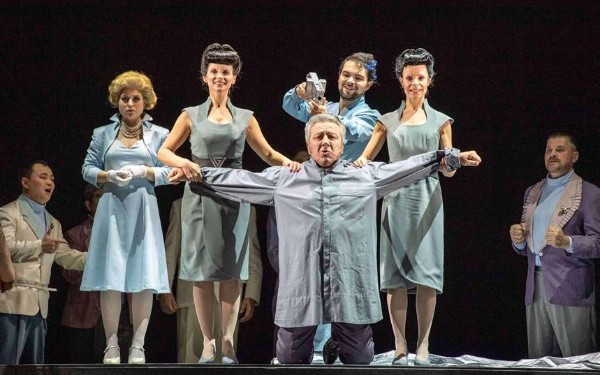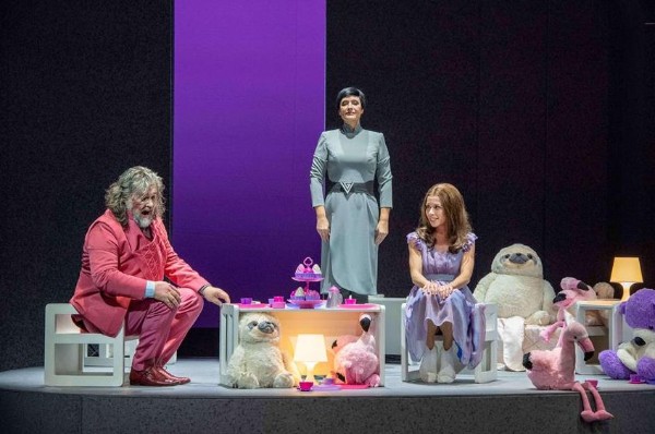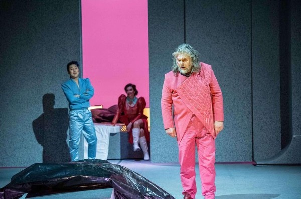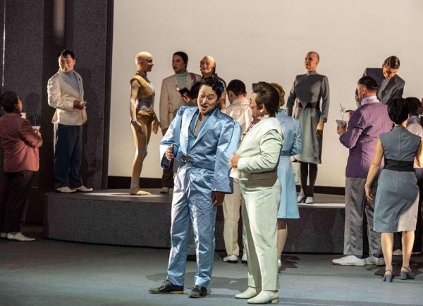 Die Party beim Herzog von Mantua (Bild oben) erinnert, dank der pastellfarbenen Kostüme von Devin McDonough – eine Beleidigung fürs Auge und eine Zumutung für die Sänger und Choristen – eher an eine Tuntenparty als an ein Gelage oder eine gefährliche Männerrunde von Spiessbuben. Man(n) betrachtet beim dezenten Sektnippen die drei neuesten Modelle der lokalen Roboterproduktion. Leider sehen diese eher Schaufensterpuppen ähnlich, als futuristischen Cyborgs. Aber es sind Mädels natürlich! Das wiederum passt nun gar nicht zu dem Eindruck, den das Outfit dieser Männergesellschaft auf den ersten Blick suggeriert. Seltsam …