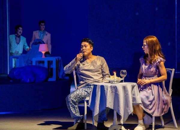 Das Spiel habe ich bei meinen Kindern vor gefühlten 100 Jahren auch immer mitgemacht. Die Beziehung zu Rigoletto erschließt das jedenfalls nicht. Es wird dann auch kurios, wenn das Kindchen sich zum Schampusschlürfen (Bild unten) mit dem Herzog kurz danach einlässt. Oh, wie so trügerisch sind Weiberherzen – also hier eher Roboterherzen.