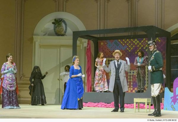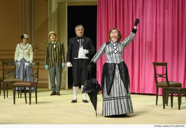 Geboten wird in Krefeld eine sehr gelungene und unterhaltsame Operetten-Inszenierung, die gleichzeitig mit ihrer kammermusikalischen Bearbeitung durch Michael Preiser überzeugen kann. Mit nur zehn Musikern (vier Bläser, vier Streicher, ein Pianist und ein Musiker für diverse Schlaginstrumente) entsteht eine Klangfarbe, wie sie perfekt auch zu einem Salon-Konzert passen würde, welches hier im Mittelpunkt der Handlung steht. In der besuchten Vorstellung lag die musikalische Leitung bei Sebastian Engel, der das Orchester souverän durch den Abend leitete. Wie gewohnt kann man sich in Krefeld auch auf ein spielfreudiges Ensemble verlassen. Als Unternehmer Waldemar Pitzelberger steht Matthias Wippich auf der Bühne, der mit schönem Bass und unterhaltsamen Schauspiel glänzt. Komische Rollen wie der der Gärtner Petermann, der nun den englischen Butler des Abends geben soll sind bei Markus Heinrich wie immer in den besten Händen. Ihm zur Seite steht im Verlauf des Abends die neue Hausdame Melusine von Lotz, die charmant von Gabriela Kuhn dargeboten wird. Mit schönem Sopran ist auch Sophie Witte eine sichere Bank auf jedem Besetzungszettel. Auch die übrigen Rollen sind mit David Esteban, Raphael Bruck, Woongyi Lee und Maya Blaustein musikalisch stark besetzt. Hinzu kommen noch acht Darsteller und Darstellerinnen, die als Gäste des Abends zu sehen und zu hören sind, sich aber handlungsbedingt vor allem auf das Buffett des Abends freuen.
