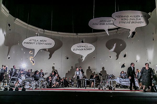 Weil „Attila“ ein einziges Intrigen-Gewusel ist, in dem alle Figuren dem Hunnenkönig ans Leben wollen, hat sich Konwitschny gemeinsam mit Dramaturgin Bettina Bartz ein ungewöhnliches Konzept erdacht: Gezeigt wird eine Gruppe von Personen, die sich ihr ganzes Leben lang bekämpfen und bekriegen: Im Prolog und erstem Akt erlebt man eine große Schulhof-Keilerei, bis das erzieherische Erscheinen des Papstes die Akteure reifen lässt. Im zweiten Akt befinden wir uns in einem Mafia-Krieg, bevor das Schreckens-Finale die Figuren altern lässt. Der Schlussakt mündet in einer mörderischen Altenheim-Intrige.