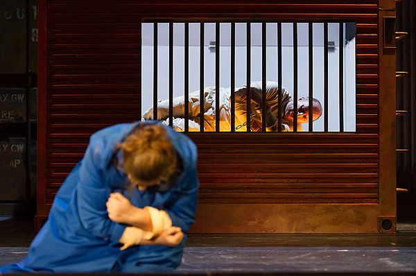 Der Mutter des Gefangenen, gespielt und gesungen von Carla Filipcic Holm, stellt die Regie eine scharf gezeichnete Mimik und Gestik in ihrer Arie über die albtraumhafte Gestalt Philipps II. zur Seite. Dunkel raunt das bevorstehende Schicksal in ihrem stimmlichen Ausdruck, präzise gesetzt schrill ihr Entsetzen. Das Zwiegespräch beider Akteure lässt Erinnerungen an die preisgekrönte Don Carlo Inszenierung Sandra Leupolds an diesem Haus mit eben jenen Darstellern aufleben. Mit symbolischer Intensität hebt die Beleuchtung den in seitlichen Containern postierten Chor hervor. Der von Richard Roberts gesungene Großinquisitor gerät vor den Partien Quinns und Holms ins Abseits. Jedoch wird er auch szenisch nicht ausdrücklich hervorgehoben, obgleich er den skrupellosen Geschäftsmann mit der passgenauen abschätzigen Kälte spielt und mit seinem Tenor sowohl den säuselnden Verführer als auch den abgeklärten Henker zielgenau zu treffen versteht.