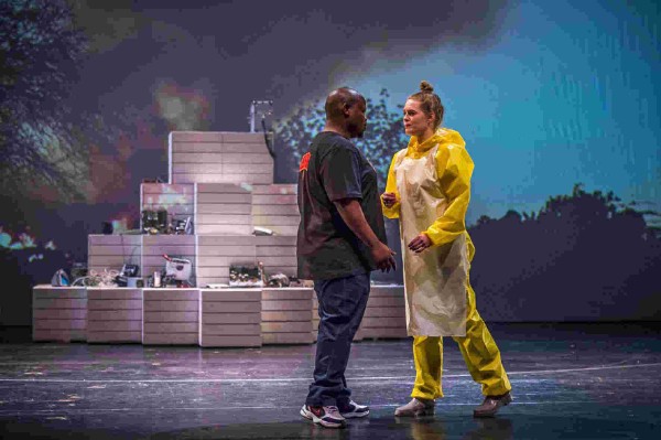 Bouba findet Lena, aber ihre Liebe hat keine Zukunft, denn der Afrikaner hat keine Aufenthaltsgenehmigung. Zudem ist Lena psychisch krank, was in einen Suizid durch Tabletten mündet. Schnell wird der Immigrant mit ihrem Tod in Verbindung gebracht und verurteilt. Es ist ja so leicht, nach der Tagesschau, bei der man sich ehrlich betroffen gefühlt hat, weil schon wieder überfüllte Boote mit Afrikanern im Mittelmeer gekentert sind und berichtet wird, daß alle ertrunken sind, innerlich ab- und umzuschalten und sich dem „Tatort“ hinzugeben. Aber im „Tatort“ geht es um das gleiche Thema und bei Anne Will anschließend auch. So war es am Freitagabend im anheimelnden Lübecker Jugendstil-Theater – vorne geschahen Dramen und denen konnte man sich nicht mal während der Pause bei Sekt und Brezeln entziehen, denn eine Pause gab es nicht. Die Filmszenen zeigten, die Handlung begleitend und unterstreichend, entweder die Arbeit der Afrikaner im Müll, Ritualtänze oder bestanden am Ende aus Sequenzen aus dem Kurzfilm „Die falsche Seite“ des burkinischen Regisseurs Lionel Poutiaire Somé. Der Clou des Ganzen ist aber einerseits Thomas Goerges Sprache, die dem Opernliebhaber aus Libretti des 19. Jahrhunderts vertraut ist und so eine ironische Brechung in das Werk bringt. Das Libretto ist angereichert mit zeitgenössischen Begriffen, Ausschnitten aus Medienmeldungen und Twitter-Nachrichten, dann wieder erscheinen Beethoven-, Mahler- und Heine-Zitate. Andererseits ist es die fast durchweg tonal gehaltene Musik des südafrikanischen Komponisten Richard van Schoor, deren manchmal jazzige Rhythmen an Kurt Weill denken lassen. Es ist aber die Mischung aus dieser ungemein farbig schillernden Klangwelt mit sehr starkem Philharmonischem Orchester der Hansestadt Lübeck unter der Leitung von Andreas Wolf und dem präzise singenden Chor unter Jan-Michael Krüger mit Passagen wie „Welcome to Toxic City“, die dem Zuhörer das Gefühl vermittelte, wie es wohl gewesen sein könnte, eine Uraufführung in den 20er Jahren am Berliner Schiffbauerdamm mitzuerleben. Die Musik ist jedoch alles andere als eklektizistisch; Tierlaute, Trommeln und der Lärm der Schrottsammler verleihen den postmodernen Klängen entsprechendes Lokalkolorit. Fast ist die Musik zu schön angesichts all des Elends, das von der Flamme des brennenden Mülls eingeschmolzen wird.