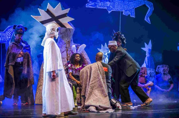Der Tenor Owen Metsileng gab einen leidenschaftlichen Bouba und Emma McNairy sang und spielte mit großer Überzeugung die engagierte Lena. Das Drama war eigentlich schlimm genug und es hätte nicht noch eine seelische Erkrankung dieser Protagonistin gebraucht. Die führte aber handlungsfunktional zu einem Verdi-haften Selbstmord. Es waren diese vielen Zitate, die auch den eher traditionell ausgerichteten Opernliebhaber immer wieder packten wie die Anrufung des Schamanen („Fétischeur! Erscheine!“), bei der man im Schnürboden sowohl Samiel als auch Loge im Geiste die Ohren spitzen sah. Es erschien als Zauberer Youngkug Jin mit mächtiger Baßstimme, seiner Macht bewußt. Daß diese Schamanen übrigens ein völlig selbstverständlicher Teil des täglichen Lebens in vielen afrikanischen Ethnien sind, verriet Lionel Poutiaire Somé in der „Kostprobe“. Dies ist eine mittlerweile bewährte und immer stärker wahrgenommene Tradition in Lübeck, bei der ein bis zwei Wochen vor der Premiere kostenlos in die Inszenierung eingeführt wird; danach kann man an der Probe einer Szene teilhaben. Er selbst hatte den Familien-Féticheur nach dem Gelingen seiner Inszenierung befragt. Das Textverständnis des deutschen Librettos war bei allen Mitwirkenden, unter denen sich kaum ein Muttersprachler befand, ausgesprochen gut, was die Inszenierung auch brauchte. Musik, Gesang, ein ausgesprochen lebhaftes Bühnengeschehen und die Videos nahmen ohnehin alle Sinne ohne Unterlaß in Anspruch.