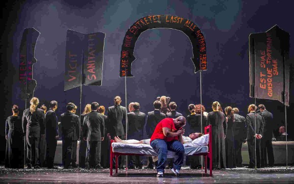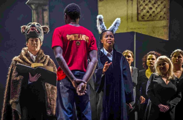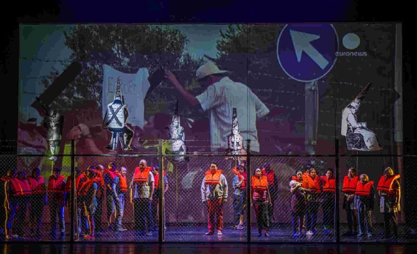 Die Totemhyäne (ebenfalls Youngkug Jin) hatte das vorausgesehen, während Caroline Nkwe als Hase zur Reise geraten hatte. Sie, stimmlich ebenfalls sehr präsent, war im schicken Europa der Anzug- und Robenträger zur Richterin mutiert. Das Vertraute ist so für Bouba zum Fremden geworden. Endstation für ihn und zahllose andere, ohne Hoffnung. Das Motto aus Dantes Höllentor im letzten Bild ließ keinen Zweifel daran. Durch begeisterten Applaus zeigte das Lübecker Publikum, daß die Botschaft angekommen war. Ein besonders schöner Einfall von Andreas Wolf war, das gesamte Orchester für den Beifall auf die Bühne zu holen. Nach dieser Vorstellung dürfte auch der Letzte begriffen haben, weswegen all diese Menschen nach Europa strömen. Wer es immer noch verstanden hat, sollte sich „L´Europénne“ in Lübeck ansehen.