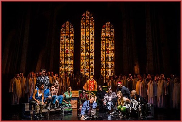 Ihm gegenüber stehen das Street-Chorus genannte Ensemble von Rock-und Blues-Sängern, die teilweise auch dem klassischen Schöngesangs-Ton verpflichtet sind, zunächst noch etwas einem etwas pauschalen Musical-Ton hingegeben, brechen vor allen die extraordnären Gänsehautstimmen vor allem der "farbigen" Sängerinnen, das "Gelernte" auf, um zu einem wahrhaftigen Gesang zu finden. Nach dem etwas flachen Beginn, gelingt es sämtlichen Solisten einen jeweils sehr persönlichen Ton zu finden. Auch hier die starke physische Beteiligung durch die vielfältigen Tanzszenen, diesmal von mehr musicalhaftem Gestus. Es ist vielleicht gemein, jetzt keine einzelne Namensnennung zu machen, doch jeder Zuschauer hat da seine eigenen Favoriten, gut waren sie alle auf ihre jeweils sehr persönliche Art, was auch den begeisternden Eindruck, der sich beim Applaus, aufzeigt.. Grandios auch die vielen Chöre unter ihren jeweiligen Leitern, nicht immer ganz auf Punkt, aber voller vokaler Emphase: Der Chor und Extrachor des Theaters Lübeck, die Kinder-und Jugendchöre "Vocalino" des Theaters Lübeck und der Musik-und Kunstschule Lübeck, der Phemios Kammerchor Lübeck und die Mitglieder des Nordelbischen Knabenchors, die Bühne war vokal wie räumlich richtig gut gefüllt. Als besondere Erwähnung der Solo-Knabensopran von Ian Jans, der nicht nur schön sang, sondern auch deutlich als Kinderstimme erkennbar war.