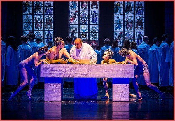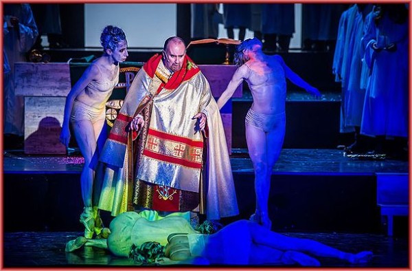 Stefan Rieckhoff stellt in seiner Ausstattung einen klerikalen Raum auf die Bühne des Lübecker Hauses, der mit den Kirchenfenstern und den "Skelettkostümen" Bezug auf den Lübecker Totentanz nimmt, ein bißchen der Stadt geschuldet, ohne wirklich einen wichtigen Bezug darzustellen, doch der Bühnenraum macht in seinen Veränderungen und Falk Hampels Licht einen großen Eindruck. Tom Ryser hatte in der letzten Spielzeit schon mit Purcells "Fairy Queen" einen großen Erfolg mit einem genreübergreifenden Stück in der Hansestadt landen können, bei "Mass" gelingt ihm zwar der große Bogen, aber über einzelne Ideen ließe sich durchaus streiten, es ist halt ein wirklich schwieriger Fall mit diesem Werk. Der Priester versucht also in diesem Raum eine Messe zu feiern, immer wieder tauchen dabei vier Tänzer auf, die sich schwer beschreiben lassen, vielleicht am ehesten als Gottesidee beschreiben lassen; Lillian Stillwell hat eine Choreographie entwickelt, die sich dem klassischen Ballett mit modernen zuschreiben lassen und guten Effekt machen. Gerard Quinn, der Lübecker Hausbariton, beginnt die Liturgie zunächst mit salbungsvollem, runden Ton als Menschenfreund, je mehr er durch die Unterbrechungen verunsichert wird, um so facettenreicher wird sein Gesang, bei jedem "Lasset uns Beten", mit dem er zur Abfolge des Ritus zurückkehrt verpuppt er sich mehr in einen Kokon von klerikaler Messgewänderpracht, aus dem er sich bei seinem Zusammenbruch schier heraussprengt. Mit starker emotionaler Beteiligung berührt er die Zuschauer ungemein, ein echter Ausnahmekünstler.